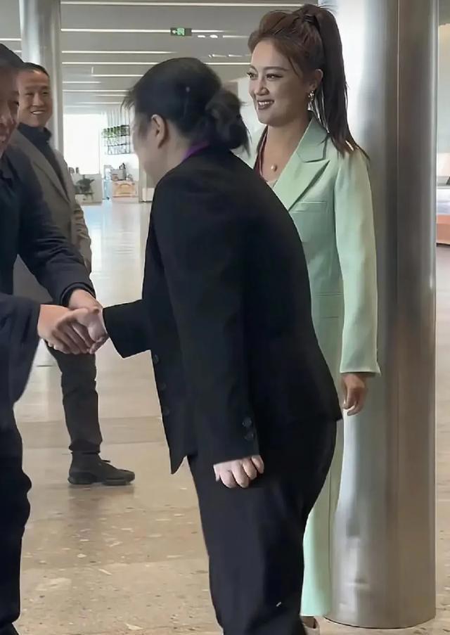 她穿着一身青绿色的套装,搭配一双白色的运动鞋,看上去非常干练,整个人颇有精英气场。